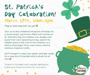 Join us at the Children’s Museum of Pooler for a shamrockin’ good time filled with hands-on St. Patrick’s Day fun! Kiddos can design and build their own leprechaun trap, search for hidden gold at the end of the rainbow in a festive scavenger hunt, and create colorful rainbow-inspired crafts.
